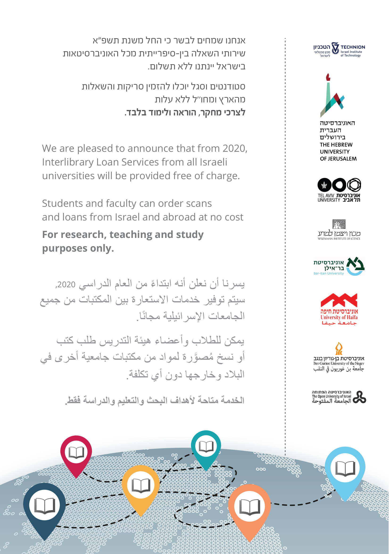Students and staff of the Faculties of Social Sciences and Management, and the Schools of Education and Social Work at Tel Aviv University can order books, articles, theses, and scans of items that are not available in Tel Aviv University libraries, from other libraries in Israel and abroad, free of charge.free of charge.